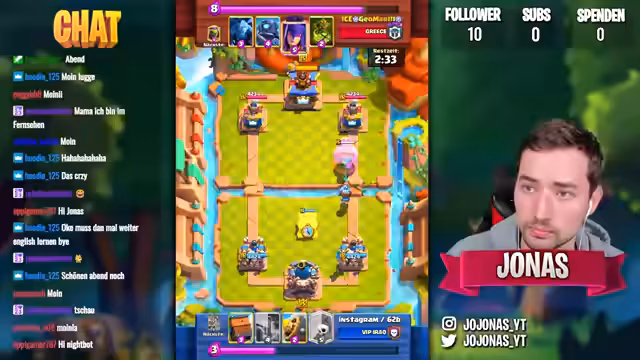 00:40:30Beim achten Sieg erhält der Streamer ein Deck, das er als nicht ganz geil, aber funktionierend beschreibt. Er kämpft gegen einen Gegner mit Goblin Giant und muss strategisch defensiv spielen. Durch den Einsatz von Hexen und Feuerball gelingt es ihm, die Situation zu kontrollieren und den Sieg zu erringen. Er zeigt sich von seiner eigenen Performance bei einem Quiz-Spiel abgelenkt.