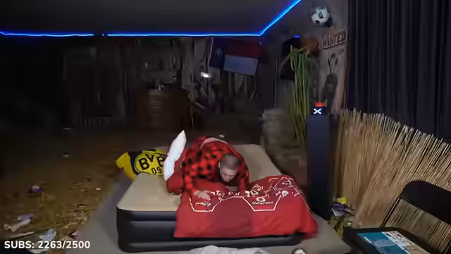 05:19:39Der Streamer bereitet sich auf die Nacht vor, während er auf Sammy wartet. Er erwähnt, dass noch viel Geld verlost wird und die Party bald richtig losgeht. Es wird angedeutet, dass möglicherweise noch Besuch erwartet wird. Währenddessen lobt er die Matratze und bedankt sich bei Robin für den Aufbau des Sets. Es kommt zu humorvollen Einlagen, wie dem 'Mittelfinger Mittwoch' und einer Anekdote über ein 'verlorenes' Ei. Der Streamer äußert sich auch zu Hautproblemen und fragt die Community nach Tipps gegen Pickel. Er zieht sich um, um warm zu schlafen, was zu einer Diskussion mit Robin führt, der das Schlaf-Outfit als unpassend empfindet.