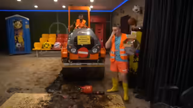 01:09:41In der letzten Phase des Streams eskaliert die Zerstörung der Studioprops. Der Streamer versucht, mit der Dampfwalze über einen Tresor, einen Helm und andere Gegenstände zu fahren, um diese zu zerstören. Dabei verliert er die Kontrolle über das Fahrzeug, stößt um und beschädigt dabei weite Teile der Einrichtung. Die Kamera wird umgeworfen und das gesamte Studio ist fortan von der Zerstörung betroffen, was das offizielle Ende der Live-Sendung markiert.