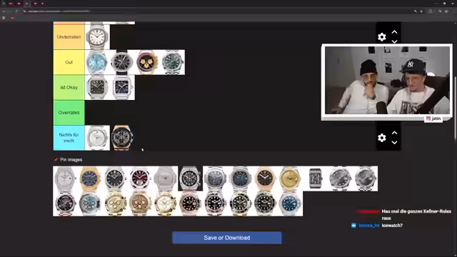 01:43:04Zum Abschluss des Streams wird ein Uhrenranking erstellt. Die Streamer bewerten eine Vielzahl von Luxusuhren, hauptsächlich von Marken wie Rolex, Patek Philippe und Audemars Piguet, anhand ihrer Optik und ihres persönlichen Stils. Die Uhren werden in verschiedene Kategorien wie "Goated", "Underrated", "Overrated" oder "Nichts für mich" einsortiert. Das Gespräch ist technisch fundiert, geht aber oft auch um den modischen Geschmack und die subjektive Wahrnehmung der Zeitmesser. Es ist eine abschließende, stilvolle Diskussion, die die Vorlieben und Expertise der Streamer im Bereich Uhren zeigt.