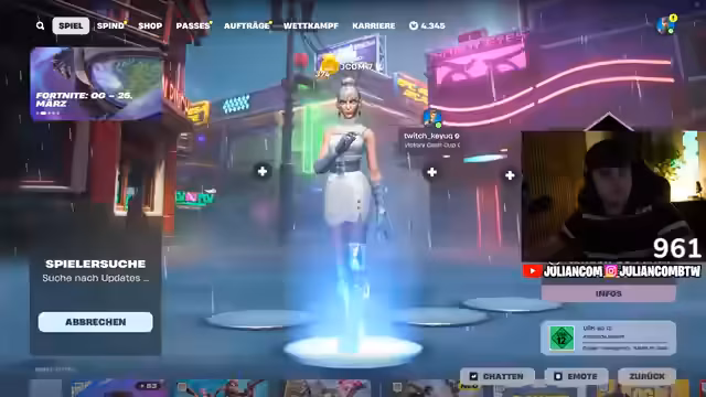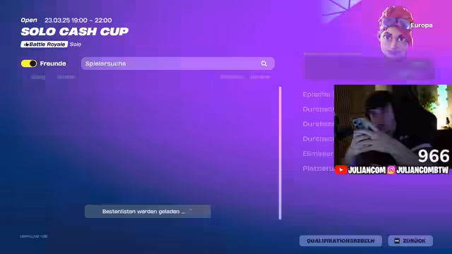 04:28:18Der Streamer fokussiert sich auf das Spielen des Solo-Cash-Cup und erlebt dabei eine Mischung aus Glück und Pech. Er äußert Frustration über das Game, besonders über das Verhalten von Gegnern und Spielmechaniken wie übermäßiges Heilen. Er kommentiert seine eigenen Leistungen und die seiner Gegner, wobei er betont, dass er trotz guter Leistungen manchmal unglücklich verliert. Der Fokus liegt auf dem Bemühen, eine hohe Platzierung und viele Kills zu erzielen, auch wenn die Performance in manchen Runden nicht seinen Erwartungen entspricht.