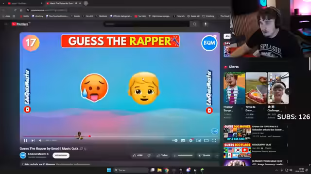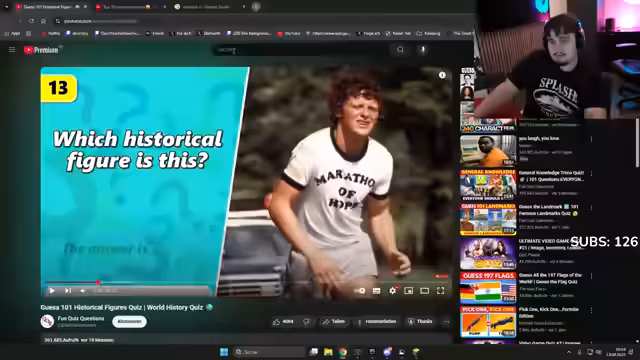 05:46:31Der Streamer versucht, verschiedene Sprachen zu erraten, die im Hintergrund abgespielt werden, darunter Russisch, Portugiesisch, Japanisch und Deutsch. Es werden Witze über die Schwierigkeit einiger Sprachen gemacht. Anschließend werden Top 100 historische Figuren aus der Weltgeschichte betrachtet, darunter Queen Elisabeth, Kim Jong Il, Nelson Mandela und Osama Bin Laden. Der Streamer kommentiert das Aussehen einiger Figuren und gibt kurze Hintergrundinformationen. Es wird überlegt, ein anderes Video mit "Guess the..." zu finden, zum Beispiel "Guess the Song". Es wird kurz ein Video mit Emojis und Rappern angesehen. Der Streamer äußert sich kritisch über die Auswahl der Emojis und die Verbindung zu den Rappern. Es wird überlegt, ob es thematisch etwas damit zu tun hat.