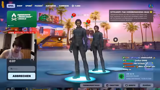 01:04:09Nach der Pause kehrt der Streamer zum Fortnite-Turnier zurück. Das Gameplay wird von Frustration geprägt, da er mehrmals von anderen Spielern eliminiert wird. Der Streamer beschuldigt ein Team des Cheatings, nachdem er mehrere schnelle und verdächtige Tode erlebt hat. Er äußert den Verdacht, dass die Gegner unfaire Vorteile nutzen, was seine Moral im weiteren Verlauf des Turniers negativ beeinflusst und zu Diskussionen im Chat führt.