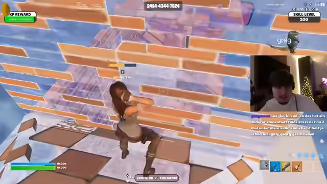 02:38:37Der Streamer beginnt intensiv Fortnite zu spielen, kommentiert das Gameplay lauter und gibt laute Reaktionen auf Ereignisse im Spiel. Er kritisiert seine eigenen Leistung, hebt besonders gute oder glückliche Kills hervor und zeigt Frustration über sein Aim und seine Fähigkeiten im Bauen, insbesondere das 'Stairs Flippen', das er als entscheidend ansieht.