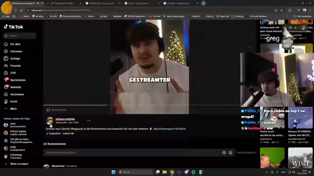 00:00:49Der Streamer begrüßt das Publikum und stellt den Hauptzweck des Abends vor: die gemeinsame Analyse der Spotify Wrapped-Ergebnisse. Um eine größere Bandbreite an Daten zu erhalten, bittet er die Zuschauer, Screenshots ihrer Top-Songs und -Künstler über verschiedene Kanäle wie Instagram, TikTok und Discord einzusenden. Er erwähnt, dass er bereits einige Einreichungen auf TikTok erhalten hat und nach weiteren sucht.
