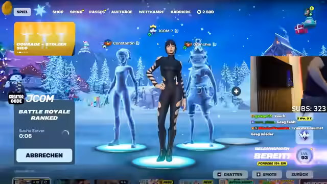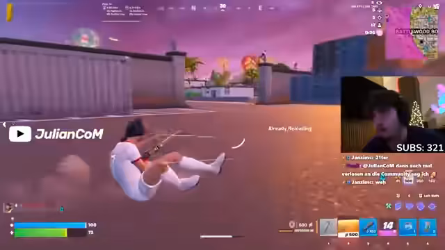 00:00:00Zu Beginn des Streams treten technische Probleme auf: Ein großes Fortnite-Update (60 GB) verursacht Ladezeiten, während Discord nicht richtig funktioniert. Julian diskutiert die Internetverbindung (Gigabit-Leitung) und optimiert anschließend die Grafikeinstellungen, um Spielabstürze zu vermeiden. Dabei testet er Render-Modi (DX12 vs. DX11), FPS-Limits und Detailstufen, um einen stabilen Modus zwischen Performance und Grafikqualität zu finden.