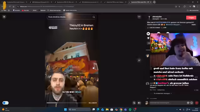00:15:30Der Streamer schildert ein chaotisches, spontanes Festival-Erlebnis in seiner Nachbarschaft, bei dem ein Rapper unangekündigt auftrat und eine riesige Menschenmenge anzog. Er beschreibt die immense Lautstärke und die Überforderung der Polizei und Anwohner, wobei er ironisch feststellt, dass man von der Lautstärke kaum etwas mitbekam. Parallel dazu interagiert er intensiv mit der Chat-Community, beantwortet Fragen und zeigt TikTok-Videos, die er als unheimlich oder amüsend empfindet.
