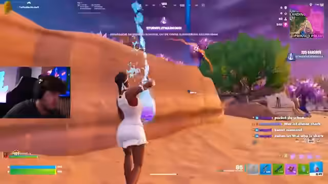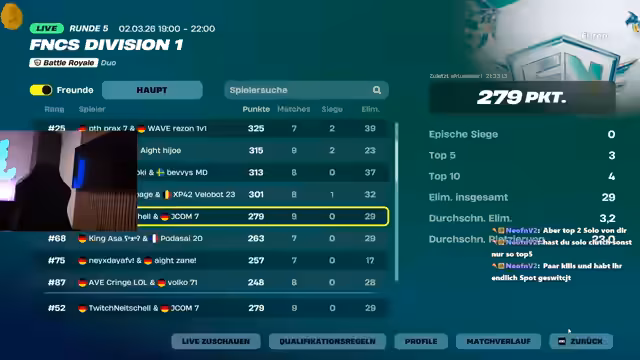 00:30:03Der Stream wechselt in den Live-Modus für den FNCS Division 1 Cup um 19 Uhr. Der Streamer ist mit seinem Team Trimax im Spiel. Es werden aktuelle Probleme des Teams angesprochen, wie z.B. der unzuverlässige PC des Teamkollegen Norman. Der Streamer gibt einen kurzen Einblick in seine Strategie, wie er tägliche Solo-Cups für Punkte nutzt und erklärt die Wichtigkeit, konstante Leistung zu bringen, um die Division 1 zu erreichen.