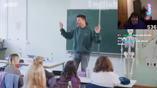 04:11:56Es beginnt ein Szenario-Teil, in dem der Streamer und sein Partner als Lehrer in eine Schule gehen, um eine Stunde Ethik zu unterrichten. Sie gestehen, ihre Rolle zunächst nicht zu kennen und der Unterricht beginnt mit einem Stimmungstest. Währenddessen wird die Partnerschaft mit der Master School beworben, die Kurse im Tech-Bereich anbietet und mit Bildungsgutscheinen nutzbar ist.