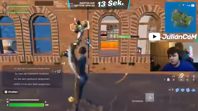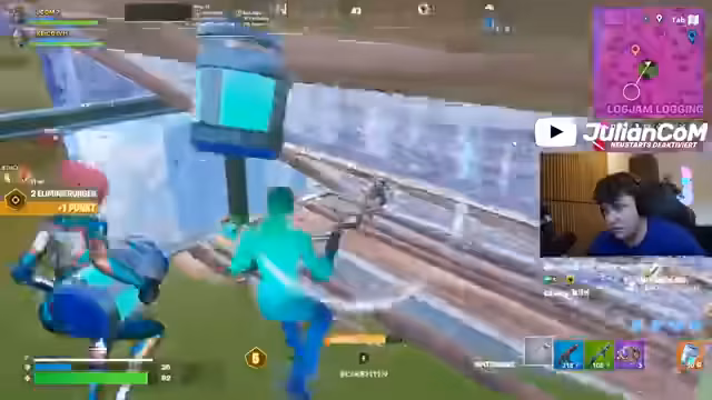01:21:44Im finalen Abschnitt des Spiels befindet sich das Team in aussichtsloser Position, nur noch wenige Spieler sind übrig. Trotzdem wird der Kampf mit Impulswaffen und Bauten bis zum Ende fortgesetzt. Das Team wird schließlich von einem anderen Spieler besiegt, der laut Streamer alles besaß und als 'Cheateste Final' bezeichnet wird.
