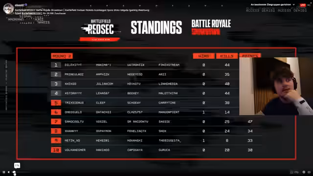 02:10:22Nach der zweiten Runde, die mit 31 Kills und einem 5. Platz endet, reflektieren die Spieler über ihre Leistung. Es wird diskutiert, wie wichtig es ist, Munition zu haben und die richtige Position zu halten. Die unterschiedlichen Spielstile der Teammitglieder werden angesprochen, wobei ein Spieler seine aggressive Warzone-Spielweise mit der eher strategischen Fortnite-Spielweise der anderen vergleicht. Für die dritte Runde wird eine noch defensivere Strategie in Betracht gezogen, da die Top-Teams nun keine Wiederbelebungschancen mehr haben. Das Team wird als 'Paradebeispiel' für die richtige Ergebnisdokumentation genannt. Die Platzierungen im Leaderboard zeigen, dass hauptsächlich Online-Spieler die Top-Positionen belegen. Die neue Regel, dass keine Wiederbelebung erlaubt ist, wird als große Herausforderung angesehen, die eine noch vorsichtigere Spielweise erfordert.