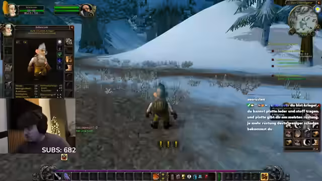 00:15:32Julian stürzt sich als absolute(r) Noob ins Spiel. Er erklärt grundlegende Mechaniken: Questgeber erkennen (Ausrufezeichen über Köpfen), Rechtsklick für Interaktion/Looten, Öffnen des Questlogs (goldenes Symbol), Kampfmodus und Rucksack. Er zeigt Rüstungs- und Waffenbelohnungen und diskutiert mit anderen Spielern über Level-Unterschiede. Es entsteht Chaos durch unklare Anleitungen und technische Fragen.