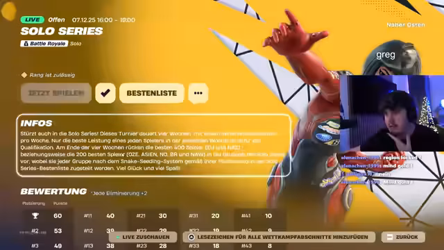 05:43:39Das Solo-Series-Turnierformat wird detailliert erklärt: Es läuft über vier Wochen (dreimal im Dezember, einmal im Januar). Das Ziel ist es, mindestens einmal in den Top 100 zu landen, um für die nächste Runde qualifiziert zu sein. Es gibt vier verschiedene Lobbys. Teilnehmer müssen in den letzten 180 Tagen mindestens 14 Turniere gespielt haben. Das Finale bietet ein sehr hohes Preisgeld.