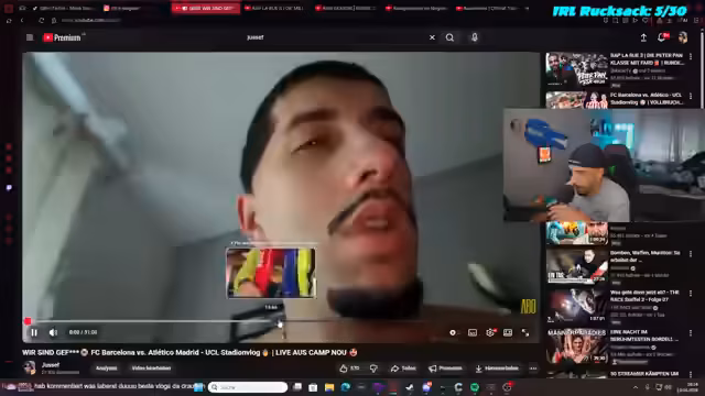 00:16:43Der Streamer analysiert die Atmosphäre im Camp Nou Stadium im Vergleich zur türkischen Liga und kommt zu dem Schluss, dass die Stimmung in türkischen Stadien intensiver ist. Er äußert sich kritisch über die vielen Touristen-Fans in Barcelona. Prognostiziert anschließend einen deutlichen Sieg von Bayern München gegen Real Madrid mit mindestens sechs Toren für Bayern und zeigt sich sehr überzeugt von dieser Vorhersage.