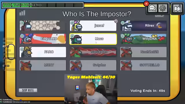 03:03:15Ein weiterer Kill ereignet sich in der Cafeteria, was zu einem neuen Votum führt. Der Streamer ist überzeugt, dass Maus der Täter ist, und appelliert an die anderen Spieler, sofort zu voten. Es kommt zu weiteren Beschuldigungen und Versuchen, die Aufmerksamkeit auf bestimmte Spieler zu lenken, während die allgemeine Anspannung im Spiel steigt.