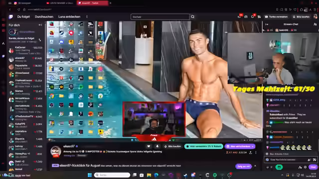 01:32:26Es werden persönliche Probleme thematisiert. Der Streamer berichtet, dass er sich mit seinem ehemaligen Mitbewohner Chef Strobel zerstritten hat, was dazu führte, dass er aus seiner Wohnung in Hamburg ausziehen musste und nun bei seiner Mutter untergebracht ist. Im Zuge dessen werden zukünftige Stream- und Eventtermine bekannt gegeben, wie eine Among Us-Runde gegen Eli, eine Fußball-WM-Übertragung und diverse Kooperationen mit anderen Streamern wie Sahide und Keanu.