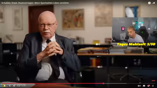 00:46:31Der Streamer wendet sich dem Thema Sportwetten und deren Suchtpotenzial zu. Es wird die Geschichte eines Mannes erzählt, der durch Wetten 800.000 Euro verloren hat und für seine Straftaten ins Gefängnis musste. Experten wie Glücksspielforscher Dr. Tobias Heyer und Senator Ulrich Meurer geben Einblicke in die psychischen und sozialen Folgen der Spielsucht. Der Staat verdient dabei Millionen an Steuern, was einen Widerspruch zu den notwendigen Präventionsmaßnahmen darstellt. Der Streamer kritisiert die legale Werbung für Sportwetten als sehr problematisch.