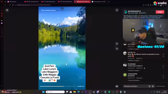 05:31:25Nachdem er an die zuvor angekündigte Frau Valentina denkt, die jedoch nicht im Stream erscheint, startet er eine Diskussion über tolle Reiseziele in der Schweiz und deren Vorteile. Der Streamer überlegt sich, mit Freunden dorthin zu fahren und Natur zu genießen, was ihn beruhigt.