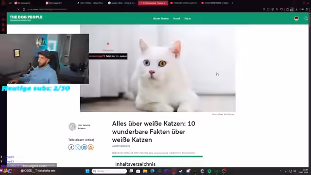 00:28:40Auf der Suche nach einer Katze im Chat, wird die Situation zunehmend humorvoll. Ein User meldet sich, als hätte er einen 'Fuhrpark' von Katzen und fragt, wie viele er braucht. Es entwickelt sich ein absurdes Gespräch, in dem der User bizarre Filter für die Katze vorschlägt, wie zum Beispiel ein drittes Bein, damit sie näher ist. Ein anderer User bietet sogar eine Katze aus Bulgarien an, was der Streamer ablehnt, weil er auf Tierschutz wert legt. Der gesamte Chatverlauf ist geprägt von viel Spaß und absurden Vorschlägen, was zur Unterhaltung der Zuschauer beiträgt.