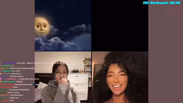 05:03:52Die Unterhaltung dreht sich um persönliche Themen wie Umzüge, familiäre Situationen und Zukunftspläne. Die Streamerin berichtet von einem Umzug zu ihren Eltern nach vorherigem Alleinleben und plant bald nach Berlin zu reisen, wo sie mit der anderen Person zusammenziehen möchte. Dabei werden Details zu möglichen Wohnsituationen, Mietzahlungen und Zimmerteilungen besprochen, mit humorvollen Kommentaren und spatziellen Einwürfen.