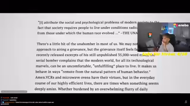 00:30:21Der Streamer präsentiert einen Twitch-Doc über den Unabomber, Ted Kaczynski. Im Dokument wird dessen Biografie geschildert, von seinem intelligenten Mathematik-Studium in Harvard bis zu seinem Leben als Terrorist. Es wird die These diskutiert, dass CIA-Experimente unter dem Codenamen MKUltra während seiner Studienzeit eine Rolle bei seiner Radikalisierung gespielt haben. Diese Thematik löst eine Diskussion über psychologische Experimente und deren heutige Relevanz im Chat aus.