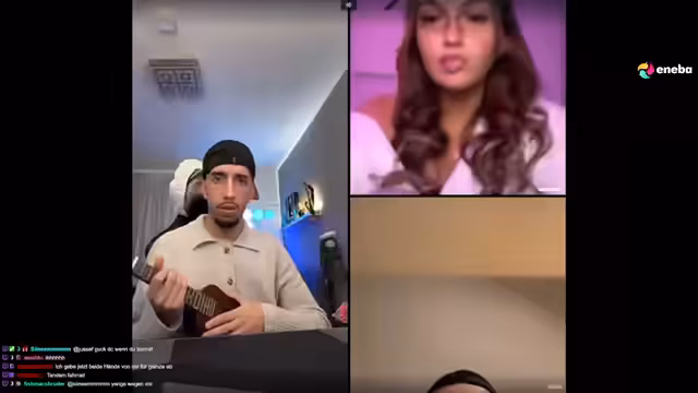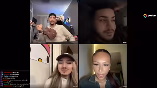 02:31:11Nach den Spannungen kam es zu einer lockereren, humorvollen Interaktion mit der US-amerikanischen Gastin Rebecca. Der Streamer lud sie ein, auf seiner Gitarre zu spielen und einen Song zu singen. Rebecca sang daraufhin den Kinderreim 'Down by the bay' und beschrieb ihren Tagesablauf, einschließlich eines Essens mit Freunden. Die Atmosphäre war verspielt und sie bezeichneten sich gegenseitig als 'Habibi' und 'Babygirl'. Auch die Teilnehmer Karamell und Rohat wurden in den Dialog miteinbezogen, was zu einem musikalischen und sprachlich bunten Beispielaustausch führte.