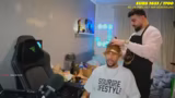00:27:07Der Friseur ist eingetroffen und die eigentliche Haarveränderung beginnt. Der Streamer zeigt sich sehr angespannt und ängstlich, besonders vor dem ersten Blondierungsprozess, da er es als unangenehm und brennend beschreibt. Der Friseur nimmt technische Geräte wie eine Koka-Waage und eine spezielle Shisha zum Löcherbohren in den Haaren zur Hand, was den Streamer in Verwirrung und Humor versetzt. Während des Vorgangs testet der Streamer mit einer Abstimmung, ob die Haare blau oder grün werden sollen, wobei der Friseur als bestechlich für Buchstaben auf dem Kopf gilt.