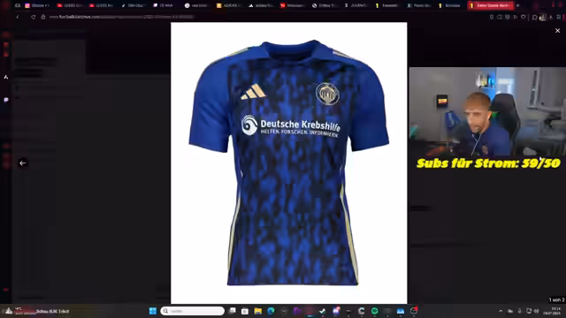 04:18:16Der Streamer bezeichnet das Trikot von Dynamo Dresden als 'schönstes Trikot, was es gibt' und kündigt an, sich alle vier Trikots zu kaufen. Bei Trikots von Rewe stellt er humorvoll fest, dass sein Vater nicht mehr unterscheiden könne, ob es Fitz oder Rewe ist. Auch das Trikot von Kaiserslautern wird als 'schönes Weinrot' bezeichnet und das Trikot von Novolein wird kommentiert, dass man es sich nicht holen solle, um nicht anfangen zu rauchen und ins Casino zu gehen.