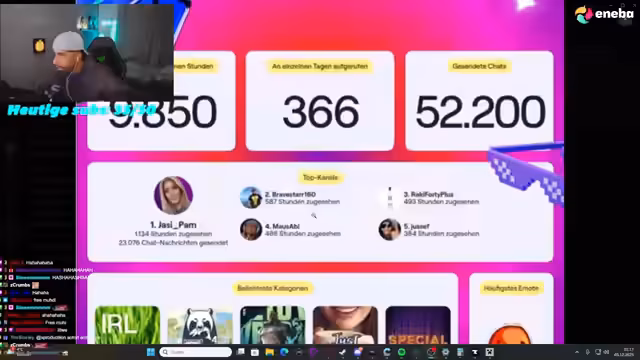 00:53:41Die eigenen Streaming-Statistiken zeigen 2428 gestreamte Stunden, was einem Durchschnitt von 6 Stunden pro Streamtag entspricht. Insgesamt haben Zuschauer 1,7 Millionen Stunden gestreamt. Es wurden 3425 Clips erstellt, und der meistgesehene Clip stammt von "eis". Bei der Betrachtung der Top-Zuschauer fallen extreme Werte auf, wie bei Ice-T mit über 7000 geschauten Stunden oder Kamil mit fast 7000 Stunden. Einige Zuschauer werden aufgrund ihrer extremen Bildschirmzeiten und Aktivitäten im Chat thematisiert.