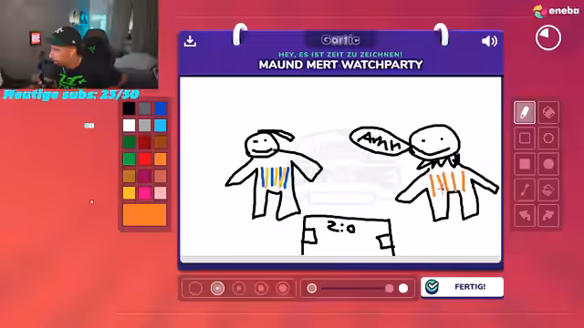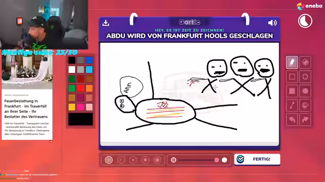 03:35:42Die Teilnehmer des Streams diskutieren über die Qualität der Zeichnungen im Spiel, wobei einige die Kunstwerke als „kindisch“ und „unnötig“ bezeichnen. Es entsteht eine Debatte über die Interpretation der Bilder und die Schwierigkeit, die dargestellten Konzepte zu verstehen. Währenddessen wird das Spiel "Gartic Phone" erwähnt, und es wird festgestellt, dass einige Spieler Schwierigkeiten haben, die Begriffe zu erraten oder korrekt darzustellen. Die Stimmung ist ausgelassen, aber auch leicht frustriert, da einige Runden nicht wie erwartet verlaufen. Es wird über die Notwendigkeit gesprochen, die Zeichnungen klarer zu gestalten und die Regeln des Spiels besser zu befolgen, um Missverständnisse zu vermeiden. Die Spieler versuchen, sich gegenseitig zu motivieren, die Runde zu beenden und bessere Ergebnisse zu erzielen, während sie gleichzeitig über die lustigen und manchmal absurden Ergebnisse lachen.