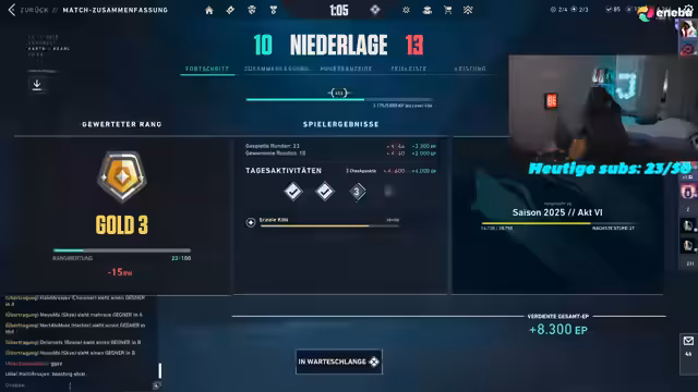 04:47:48Die Valorant-Runde entwickelt sich zu einer frustrierenden Erfahrung, da das Team weiterhin Schwierigkeiten hat, Siege zu erringen. Es wird offen über die mangelnde Koordination und die individuellen Fehler gesprochen. Die Spieler äußern ihren Unmut über die Gegner, die sie als „Stream-Sniper“ verdächtigen, und es werden scherzhaft Flüche und Beleidigungen ausgetauscht. Die Idee, Strafen für den „Bottom Fragger“ einzuführen, wird diskutiert, um die Motivation zu steigern und die Spieler zu ermutigen, sich mehr anzustrengen. Es wird jedoch auch die Sorge geäußert, dass dies zu einer zu ernsten Atmosphäre führen könnte. Trotz der anhaltenden Niederlagen versuchen die Spieler, ihre Strategie anzupassen und neue Ansätze zu finden, um die Gegner zu überwinden. Die Diskussion über die Agentenwahl und die Notwendigkeit eines besseren Teamplays bleibt ein zentrales Thema, während sie versuchen, die Runde noch zu drehen.