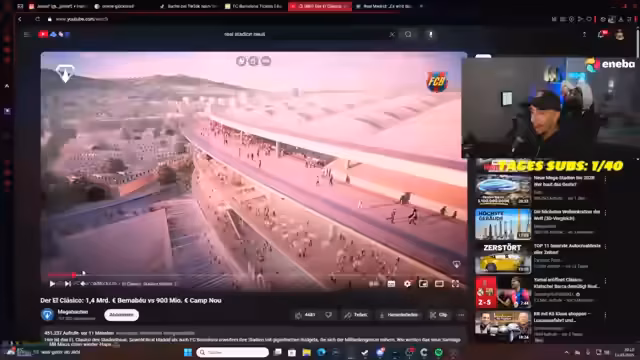 00:09:02Der Streamer äußert den Wunsch, am 9. April ein Barcelona-Spiel gegen Atletico Madrid zu besuchen. Allerdings gibt es ein Problem: Er benötigt jemanden, der Partner von Barca ist, um an gute Tickets zu gelangen, ähnlich wie bei Passo League bei Gala vs. Fener. Er erwähnt, dass er und Maus zwei Tickets benötigen und diese selbstverständlich bezahlen würden, jedoch bessere Plätze bevorzugen, um einen ansprechenden Stadionvlog zu bieten. Der Streamer überlegt, ob er über Eiken oder direkt über Barca an solche Tickets kommen könnte und schätzt die Kosten auf etwa 200 Euro pro Ticket, was sich jedoch für den Content lohnen würde. Abschließend wird das aktuelle Stadion als hässlich bezeichnet, wobei das neue Barca-Stadion, dessen Fertigstellung für 2028 erwartet wird, als potenziell beeindruckend angesehen wird.