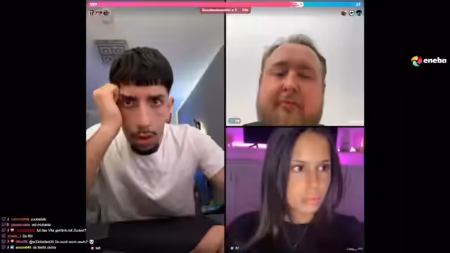 00:07:42Der Streamer initiiert ein interaktives Blind Date zwischen dem Zuschauer 'Angelo' und einer 'Katharina'. Nachdem beide sich kurz vorstellten, wurden persönliche Themen wie körperliche Vorlieben und der Körperzähler (Bodycount) thematisiert, was zu einer unkonventionellen und anstößigen Gesprächsatmosphäre führte. Im weiteren Verlauf wurde die Maske abgenommen, und es kam zu körperlichen Interaktionen, bei denen Katharina Angelos Arm und Hals roch und er ihren Bauchnabel berührte. Der Streamer moderierte die interaktiven Elemente und sorgte für eine lockere, wenn auch ungewöhnliche Dynamik zwischen den beiden.