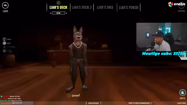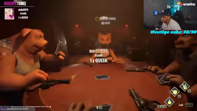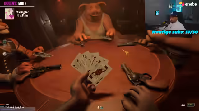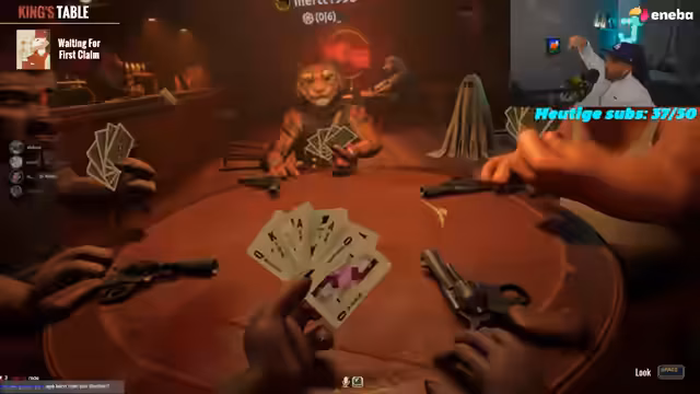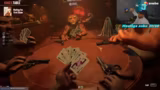 02:52:01Die Gruppe startet das Spiel Liar's Bar, ein Kartenspiel, bei dem die Spieler lügen müssen, um zu gewinnen. Die Grundregeln werden erklärt: Man hat Karten in der Hand und muss beim Ablegen entweder die Wahrheit sagen oder lügen. Wird eine Lüge aufgedeckt, schießt derjenige, der lügte, mit einer virtuellen Waffe und verliert das Spiel. Die ersten Runden beginnen, und die Spannung steigt.