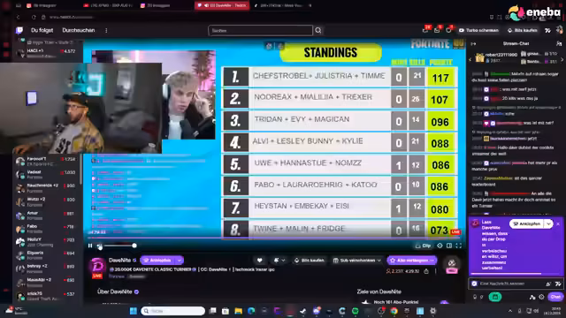 01:37:18Jusseff kündigt eine Fortnite Watch Party mit Bastard Production an. Während des Streams äußert er Frustration über schlechte Leistungen in den ersten Turnierrunden, betont aber die Notwendigkeit, weiterzukämpfen. Pläne für das weitere Vorgehen im Wettbewerb werden kurz diskutiert, insbesondere die Strategie für kommende Matches.
