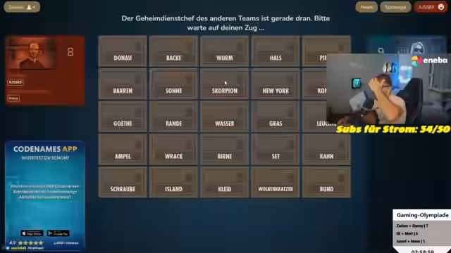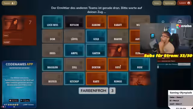 05:33:01Das neue Spiel 'Codenames' beginnt, und die Regeln werden erklärt. Das Team wird in zwei Gruppen aufgeteilt, die gegeneinander antreten. Der Fokus liegt darauf, Wörter zu erraten, ohne das 'schwarze' Wort zu treffen, was zu strategischen Überlegungen und teilweise hitzigen Diskussionen führt. Der Streamer agiert als 'Ermittler' und versucht, seinem Team gezielte Hinweise zu geben, während die Gegenseite versucht, ihre Taktiken zu verschleiern.