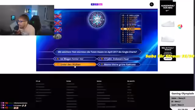 03:20:43Zu Beginn des Streamsegments spielt das Team mehrere Runden des Spiels Geo Guessr. Der Streamer äußert sich unzufried über das spielerische Niveau und die Ergebnisse, besonders über eine Drecksgiraffe, die unrealistische neun Milliarden Mal gegoogelt wurde, und eine Band mit 800.000 Sekunden, die niemand je gesehen hat. Beim Punktestand nach den ersten Runden liegt das Team mit fünf oder sechs Punkten hinter anderen Spielern, was zu Frust führt. Trotz des schlechten Starts wird ein weiteres Spiel geplant, bei dem jeder für sich spielt, die Punkte aber am Ende zusammengerechnet werden. Stream-Interaktionen wie Spenden und Abonnements werden von den Spielern ignoriert.