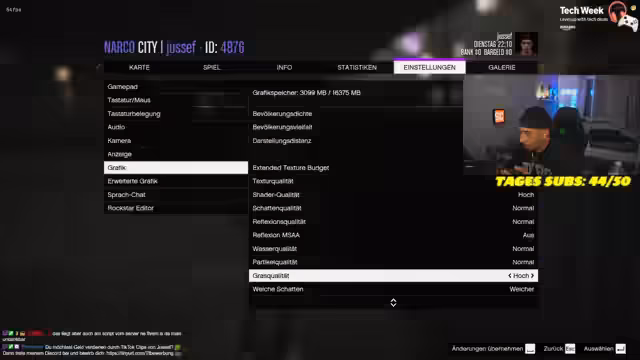 03:15:12Während der GTA:RP-Session beschäftigt der Streamer sich intensiv mit der Performance-Optimierung. Er ist unzufrieden mit der ruckelnden Grafik und wechselt mehrmals die Einstellungen. Er probiert Direct 11, die MSAA-Anzahlisierung, V-Sync und TXAA aus, um eine flüssigere Darstellung zu erreichen. Nach mehreren Versuchen, die Qualität zu verbessern, verliert er die Geduld und stellt alle Grafikeinstellungen auf 'normal', was jedoch zu einer sehr kindlich anmutenden Optik führt, die ihn ebenfalls frustriert.