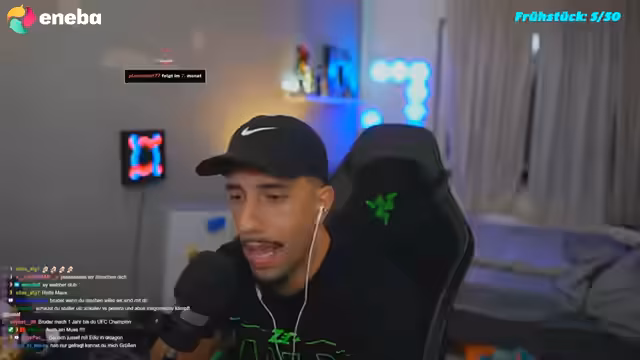 03:56:03In einer frühen Phase des Streams diskutiert der Sprecher über UFC-Kämpfe und teilt persönliche Anekdoten. Er erwähnt Miki TV und Marokkaner, vergleicht Tattoos und deutet an, dass der Wikinger im bevorstehenden Fight gewinnen könnte. Es folgen Erinnerungen an eine vergangene Fight Night mit Freunden wie Panne, Danny und Maus, die als lustig beschrieben wird. Die Stimmung ist locker und gesprächig, mit Fokus auf die anstehenden Kämpfe und die Vorbereitungen des Publikums.