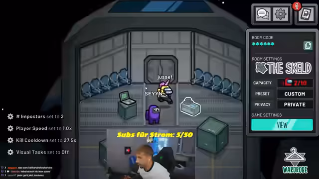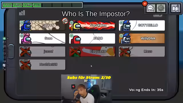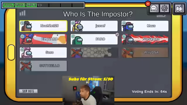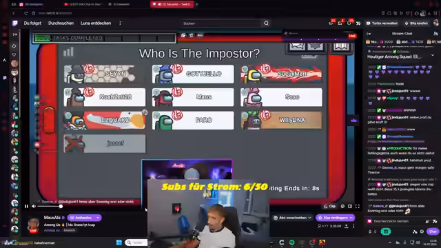 00:33:37Der Streamer kündigt einen Wechsel des Formats an und geht mit seinen Freunden in einen Discord-Server, um das Spiel "Among Us" zu spielen. Es kommt anfanglich zu technischen Problemen mit dem Server-Join, weshalb die Runde verzögert startet. Spieler wie "Noah Z." und "Maus" sind anwesend. Der Streamer erklärt kurz die Regeln und betont, dass der private Chat während der Runde deaktiviert ist, um Cheating zu verhindern. Es wird ein neues Spiel gestartet, nachdem alle Probleme gelöst sind.