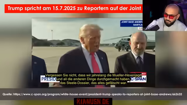 03:28:46Der Sprecher diskutiert Aussagen von Tucker Carlson zur möglichen Mossad-Tätigkeit Epsteins und zeigt Videos von Trump mit Epstein. Besonders wird ein Moment analysiert, in dem Trumps Handelsminister Howard Lutnik neben Epstein lacht. Der Sprecher zitiert Regierungsberichte, dass Trumps Name in Epstein-Ermittlungsakten auftaucht, und kritisiert Trumps Versuche, die Affäre herunterzuspielen. Die Ankündigung des US-Justizministeriums, Ghislaine Maxwell zu befragen, wird als taktischer Schritt gewertet, um die Veröffentlichung der Akten zu verhindern.