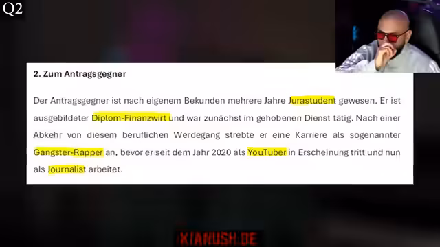 01:55:12Huch wird vorgeworfen, den Sprecher fälschlicherweise als Journalist darzustellen, obwohl dieser lediglich als Influencer mit Sozialkritik tätig ist und in einer Steuerkanzlei arbeitet. Der Sprecher betont, dass diese Falschdarstellung bewusst sei, um die strengeren Regeln für Journalisten auf ihn anzuwenden. Er sieht darin einen versuchten Prozessbetrug, da Laienprivilegien ignoriert würden. Huchs Behauptung, der Sprecher sei als Gangster-Rapper tätig gewesen, wird als historisch falsch zurückgewiesen.