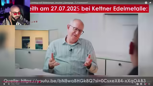 00:52:36Es wird diskutiert, wer die Bilderberger gegründet hat, wobei Josef Rettinger genannt wird. Es wird angemerkt, dass Rettinger Freimaurer war und nach dem Zweiten Weltkrieg Mitbegründer der Europäischen Bewegung und maßgeblich an der Gründung der Bilderberg-Gruppe beteiligt war. Ursprünglich erwog er eine Karriere als Priester, verwarf diese Idee jedoch nach drei Monaten im Noviziat der Jesuiten. Es wird kritisiert, dass Walter Veith Rettinger fälschlicherweise als Jesuiten darstellt und seine Freimaurer-Verbindung verschweigt. Weiterhin wird auf den Kalergi-Plan und Verbindungen zum CIA-Direktor hingewiesen. Es wird behauptet, dass die EU nicht gegründet wurde, um die USA zu schwächen, und auf Beweise aus einem Artikel der New York Times von 1948 verwiesen. Ein weiterer Einspieler von Veith bei Dominik Kettner wird gezeigt, in dem es um die Rothschilds als päpstliche Bankiere geht. Es wird argumentiert, dass Lord Rothschild für den Papst und den Vatikan tätig war und 1917 die Balfour-Erklärung zur Gründung eines Staates in Palästina erhielt. Es wird auf den Zionistenkongress von 1897 in Basel und Theodor Herzls Tagebucheintragung hingewiesen, in der er die Gründung des jüdischen Staates vorhersagte. Es wird dazu aufgerufen, selbst nachzudenken und die Macht dieser Kreise zu hinterfragen.