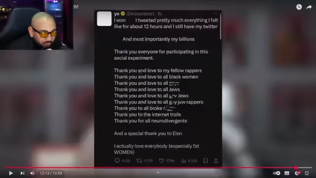 03:19:19Die Tweets von Kanye West werden als ekelhaft bezeichnet, wobei viele bereits gelöscht wurden. Sein Statement, das auf einem chinesischen TikTok-Abklatsch veröffentlicht wurde, wird als verwirrt und nicht authentisch wahrgenommen. Es klingt, als würde jemand ihn nachahmen oder wie eine KI. Es wird spekuliert, dass Kanye West entweder Hilfe benötigt oder sein Verhalten als Promo für ein Album inszeniert. Sein Verhalten wird als 'crazy' bezeichnet, und es wird vermutet, dass er möglicherweise mit den Auswirkungen seines Konsums zu kämpfen hat und Therapie benötigt. Da er jedoch nicht mehr gecancelt werden kann und finanziell unabhängig ist, scheint es schwierig, ihn zu erreichen. Es wird die Frage aufgeworfen, inwieweit sein Umfeld, insbesondere seine Frau, ihn kritisch hinterfragen sollte, da ein Partner in der Lage sein sollte, Fehlverhalten anzusprechen. Abschließend wird festgestellt, dass Kanye Wests Verhalten nicht entschuldbar ist und seine Fans enttäuscht sind, obwohl sie einiges von ihm gewohnt sind.