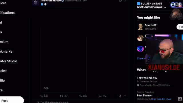 01:08:20Um 22 Uhr östlicher Zeit postete der Weiße Haus Account zwei seltsame Videos, die hauptsächlich aus einem schwarzen Bildschirm mit Störungen bestanden. Ein kurzer Frame zeigte eine amerikanische Flagge, die Beschreibung bestand nur aus zwei Emojis. Viele Zuschauer hörten eine iPhone-Textbenachrichtigung im Video und spekulierten, es handle sich um Aktivierungssignale für sogenannte Schläferzellen. Der Streamer analysiert, dass die Postings kein Zufall sein können und mutmaßt, dass es sich um einen Köder für QAnon-Anhänger handelt. Er verweist darauf, dass bei QAnon nichts zufällig ist, alles ein verschlüsseltes Signal für zukünftige Ereignisse sei, ähnlich wie die Veröffentlichung der Flagge angesichts der hochspannenden Lage zwischen den USA und dem Iran.