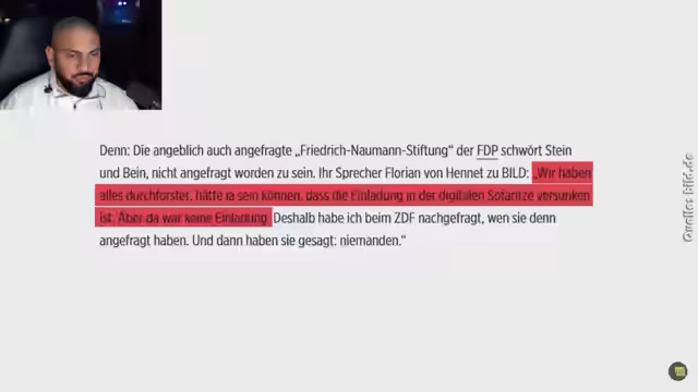 01:13:20Die angebliche Voreingenommenheit in der ZDF-Sendung wird detailliert analysiert. Es wird beschrieben, wie bei der Vorstellung der Parteispitzen nur bei Grünen und Linken im Publikum Applaus erfolgte, während bei anderen Parteien Schweigen oder Kopfschütteln zu sehen war. Der ZDF-Hauptstadt-Korrespondent Dominik Tretka soll zugegeben haben, dass das Publikum gezielt von den eher linken Universitäten HU und FU Berlin angeworben wurde. Dies wird als direkter Versuch der Manipulation des öffentlichen Diskurses gewertet und soll Demokratie und Meinungsfreiheit gefährden.