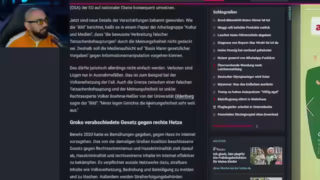 01:24:26Es wird die geplante Einführung eines Gesetzes kritisiert, das Lügen in der Öffentlichkeit verbieten soll. Es wird befürchtet, dass dies zu Zensur führen und kritische Stimmen unterdrücken könnte. Es wird die Ironie hervorgehoben, dass Politiker, die selbst oft lügen, über die Wahrheit entscheiden sollen. Es wird die Frage aufgeworfen, wer bestimmen soll, was Wahrheit ist und was nicht, und die Gefahr von Manipulation und Missbrauch durch die Medienaufsicht betont. Es wird auf einen Artikel verwiesen, der besagt, dass die Medienaufsicht künftig gegen Informationsmanipulation sowie Hass und Hetze vorgehen soll. Es wird kritisiert, dass Hass und Hetze subjektive Emotionen sind und die Gefahr besteht, dass kritische Berichterstattung unterdrückt wird. Es wird die Frage aufgeworfen, wie man nachweisen will, dass jemand bewusst falsche Informationen verbreitet. Es wird die Sorge geäußert, dass die Meinungsfreiheit eingeschränkt wird und die Entwicklung in eine falsche Richtung geht.
