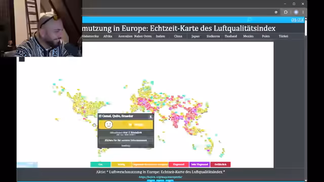 00:02:59Nach der Begrüßung vieler langjähriger und neuer Follower leitet der Streamer einen neuen Themenschwerpunkt ein. Er stellt fest, dass ihm bei schlechter Luftqualität eher übel wird und beschließt, dies genauer zu untersuchen. Gemeinsam mit der Community öffnet er die Webseite des Umweltbundesamtes und präsentiert die offiziellen Luftdaten. Die Analysen zeigen eine katastrophale, rot markierte Feinstaubbelastung (PM2,5 und PM10) in ganz Deutschland, die als sehr gesundheitsschädlich eingestuft wird.