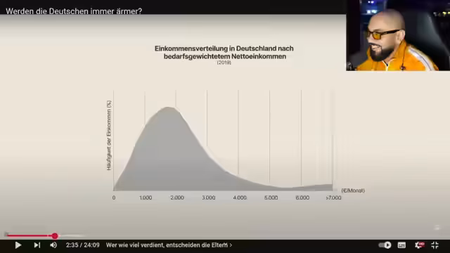 00:53:10Es wird über die Schwierigkeit gesprochen, sich aus eigener Kraft aus der Bildungs- und Gehaltsklasse der Vorfahren hochzuarbeiten. Es wird festgestellt, dass die Schere bei den Einkommen in Deutschland immer weiter aufgeht und sich immer mehr Einkommen am oberen Rand konzentrieren. Es wird erwähnt, dass der Mindestlohn früher sehr niedrig war, was den Streamer dazu bewegt hat, sein Leben zu ändern. Es wird diskutiert, wie sich die Einkommensschere auch auf das Vermögen der Eltern auswirkt. Es wird festgestellt, dass in Deutschland weniger Menschen Immobilien besitzen als in anderen europäischen Ländern, was zu mehr Vermögensungleichheit führt. Immobilienbesitzer bauen Vermögen auf, während Mieter ihr Geld an jemand anderen überweisen. Es wird über das Vererben von Vermögen gesprochen und dass dies oft zu noch größeren Ungleichheiten führt. Es wird erwähnt, dass ein Westdeutscher im Schnitt fast doppelt so viel erbt wie ein Ostdeutscher. Es wird beobachtet, dass viele junge Familien in geerbten Häusern leben, ohne etwas dafür tun zu müssen.