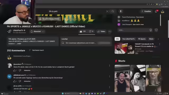 01:32:00Es wird die Musik bei YouTube-Premieren kritisiert und gefordert, dass Giano die Anfangsmusik ändert. Es wird angemerkt, dass die Zuschauer- und Like-Zahlen gestiegen sind. Es wird erwähnt, dass der Streamer das Video selbst noch nicht gesehen hat und gespannt ist, was daraus gemacht wurde. Es wird die Live-Premiere des Songs "Last Dance" von PA Sports, Djamule, Mucho und Kianos gestartet. Es werden Textpassagen aus dem Song zitiert, die von Gewalt, Drogenkonsum und Kritik an der deutschen Rapszene handeln. Es wird die Zeit vermisst, in der es noch kein Cash, Wax und Mei gab. Es wird über Verrat und falsche Freunde gerappt. Es wird die Straßenpoesie und der Kampf ums Überleben thematisiert.